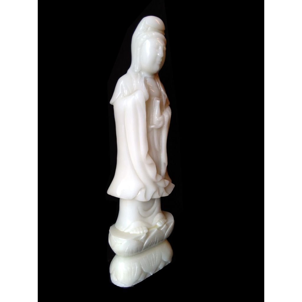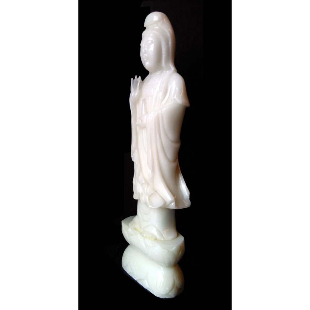 A large statue of Guan Yin – the Goddess of Mercy – standing in a raised position, holding the bottle of dew from which she can dispense her mercies in one hand and offering a mudra with the other. Carved from a pure white stone, this piece shows nice detail of the goddess and is drilled at the back to facilitate mounting on a wall.
